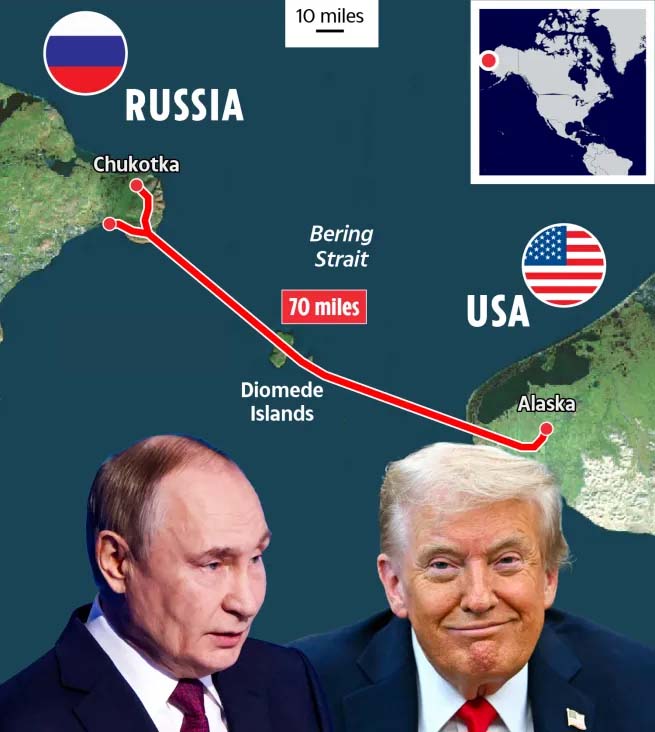 ඇමෙරිකා එක්සත් ජනපදය සහ රුසියාව භෞතිකව වෙන් කරන සමුද්ර සන්ධිය බේරිං සමුද්ර සන්ධියයි. මෙම සන්ධිය, මෙනමින් නම් කර ඇත්තේ 1728 දී මෙහි යාත්රා කළ ඩෙන්මාර්ක ජාතික රුසියානු ගවේෂකයෙකු වන විටස් බේරිං සිහි කරමිණි. මෙම සමුද්ර සන්ධියෙන්, ආසියා මහාද්වීපයේ පිහිටි රුසියාවේ චුක්චි අර්ධද්වීපය සහ උතුරු ඇමෙරිකා මහාද්වීපයේ පිහිටි ඇමෙරිකාවේ ඇලස්කාවේ සෙවර්ඩ් අර්ධද්වීපවෙන් කරයි. පැසිෆික් සාගරයේ කොටසක් වන බේරිං මුහුද සහ ආක්ටික් සාගරයේ කොටසක් වන චුක්චි මුහුද සම්බන්ධ වන්නේ ද මෙම බේරිං සමුද්ර සන්ධියෙනි. සමුද්ර සන්ධියේ පටුම ස්ථානයේ ඇමෙරිකාව සහ රුසියාව අතර දුර කිලෝමීටර 85 (සැතපුම් 53) ක් පමණය. මෙය සාපේක්ෂව නොගැඹුරු සමුද්ර සන්ධියක් වන අතර, එහි සාමාන්ය ගැඹුර මීටර 30 සිට 50 දක්වා පමණ යැයි ද පැවැසෙයි. සමුද්ර සන්ධියේ මධ්යයේ කුඩා දූපත් දෙකක් පිහිටයි. කුඩා ඩයෝමීඩ් දූපත සහ මහා ඩයෝමීඩ් දූපත යනු එම දූපත්ය. කුඩා ඩයෝමීඩ් දූපත අයත් වන්නේ ඇමෙරිකාවටය. මහා ඩයෝමීඩ් දූපත අයත් වන්නේ රුසියාවටය. මෙම දූපත් දෙක අතර දුර ඇත්තේ කිලෝමීටර් 3.8 කි. ජාත්යන්තර දින රේඛාව මෙම දූපත් දෙක අතරින් ගමන් කරයි. එබැවින්, දූපත් දෙක අතර ඉතා සුළු දුරක් තිබුණත්, ඒවායේ වේලාව දිනකින් වෙනස් වෙයි.